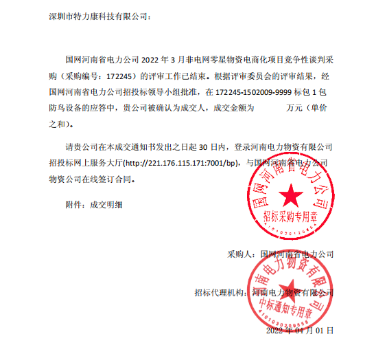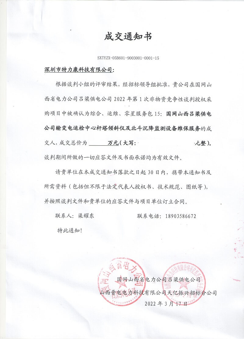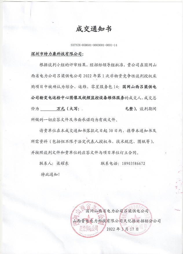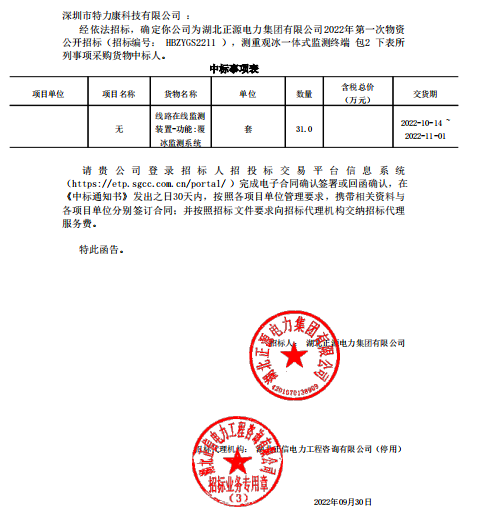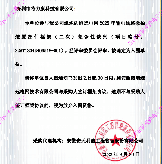 特力康中標國網黑龍江送變電工程公司的2024年度第18次物資類競爭性談判采購項目——慶陽驅鳥器物資框 特力康中標國網甘肅省電力公司省管產業單位2024年第五次物資競爭性談判授權采購項目 中標喜訊:深圳市特力康科技有限公司成功入圍許繼集團綜合能源公司輸電線路視頻在線監測裝置模塊集采項目 中標喜訊:特力康成功中標國網重慶市電力公司渝中一片區項目 特力康成功中標國網天津市電力公司2024年第二次?物?資招標項目 特力康中標國網安徽省電力有限公司蕪湖供電公司2024年3月非物質采購項目 特力康輸電線路智能AI多目監控裝置+傾斜監測守護山西輸電生命線 鄂網“全景眼”:特力康一體化視頻監控系統守護輸電線路 山東電網 “穩塔哨兵”:特力康智能桿塔傾斜監測預警裝置筑牢電力桿塔安全防線 特力康科技輸電線路高清圖像監控裝置,為河南輸電通道筑牢安全屏障 黃土高原護塔穩:特力康傾斜監測裝置為山西電網筑牢根基 黔山冰防線:特力康 “數據 + 圖像” 雙監測守護貴州輸電線路 戈壁林區的 “火情哨兵”:特力康紅外熱成像裝置守護甘肅輸電線路 內蒙電網裝上 “舞動監測眼”:特力康輸電線路防舞動監測系統守護線路安全 寧夏配電線路安裝了我司防外破電子化智能警示牌
