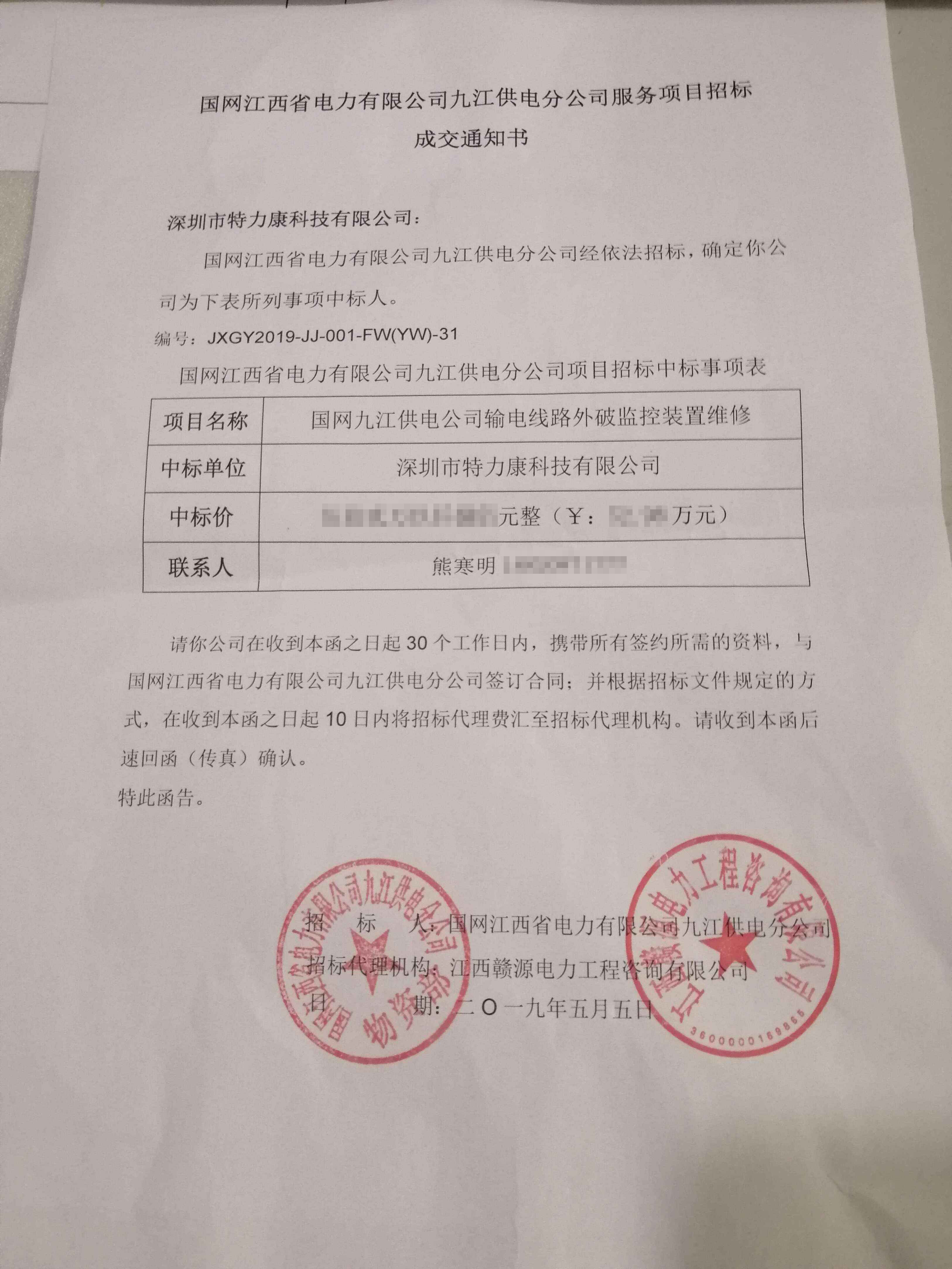 國網江西九江供電有限公司輸電線路防外破監控裝置采購項目評審工作已結束,經評審委員會評審,經國網江西九江供電有限公司招投標領導小組批準,我司被確定為此次輸電線路防外破監控裝置采購項目中標單位現將公告公示。