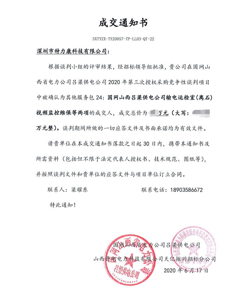 根據談判小組的評審結果,經招標領導組批準,我司(深圳市特力康科技有限公司)在國網山西省電力公司呂梁供電公司2020年第三次授權采購競爭性談判項目中被確認為其他服務包24:國網山西呂梁供電公司輸電運檢室(離石)視頻監控維保等兩項的成交人,現中標通知以下: