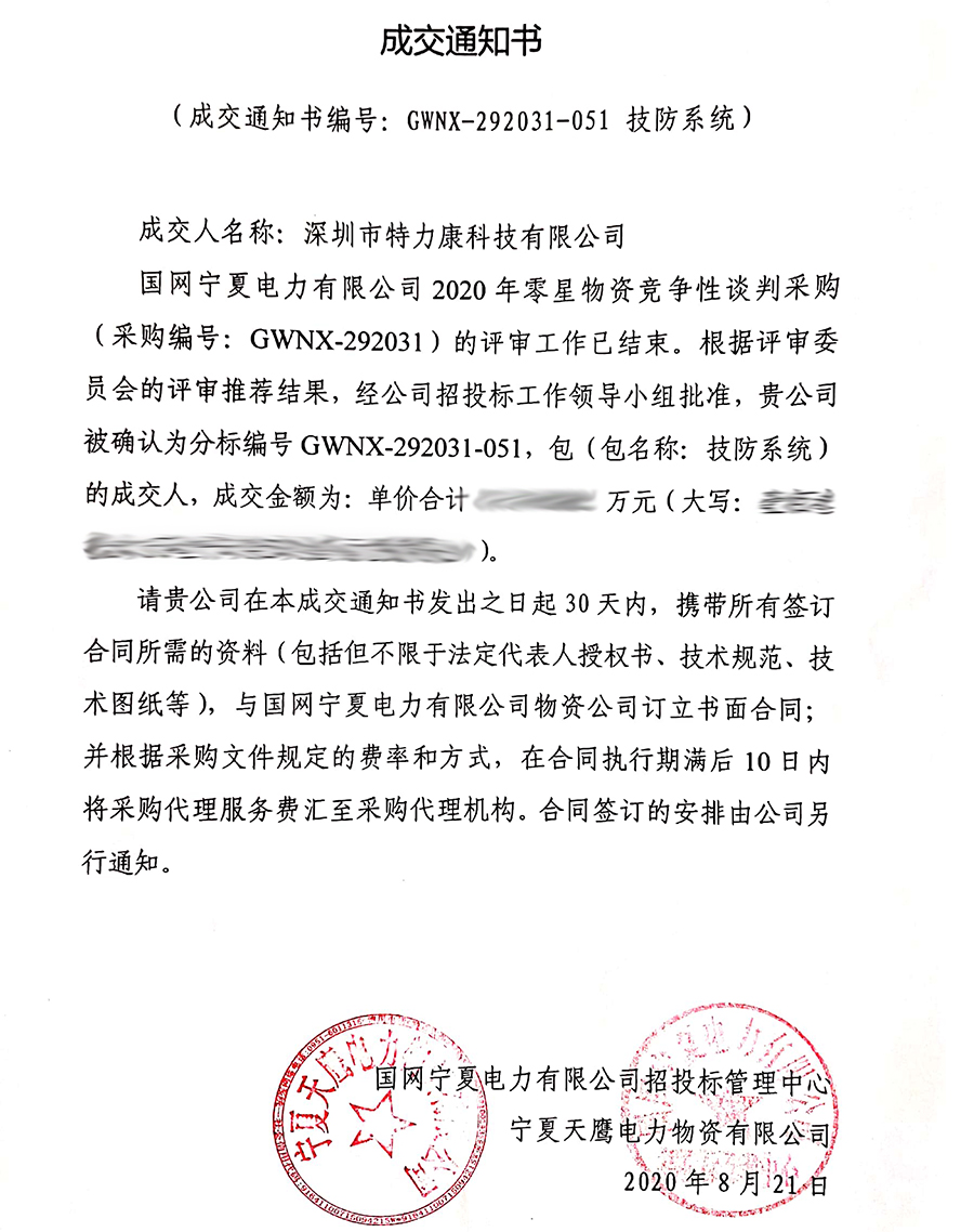 國網(wǎng)寧夏電力有限公司2020年零星物資競爭性談判采購(采購編號: GWNX-292031)的評審工作已結束。根據(jù)評審委員會的評審推薦結果,經(jīng)招投標工作領導小組批準,我司(深圳市特力康科技有限公司)被確認為分標編號GWNX-292031-047,包(包名稱:配網(wǎng)防護設施-報警裝置)及分標編號GWNX-292031-051,包(包名稱:技防系統(tǒng))的成交人,現(xiàn)發(fā)布成交通知書如下: