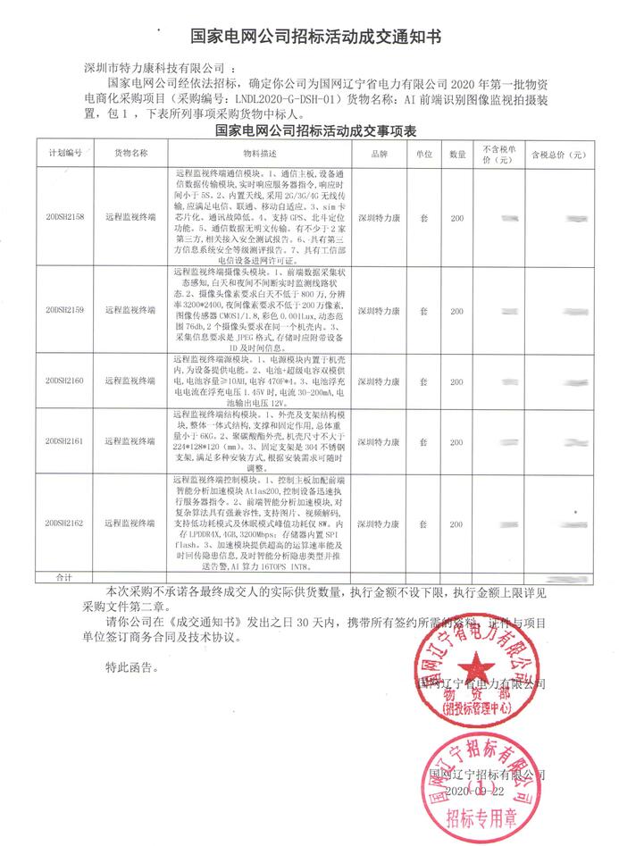 國家電網公司經依法招標,確定我司(深圳市特力康科技有限公司)為國網遼寧省電力有限公司2020年第一批物資電商化采購項目(采購編號: LNDL2020-G- -DSH-01)貨物名稱: AI 前端識別圖像監視拍攝裝置,包1,下表所列事項采購貨物中標人(附件如下)。