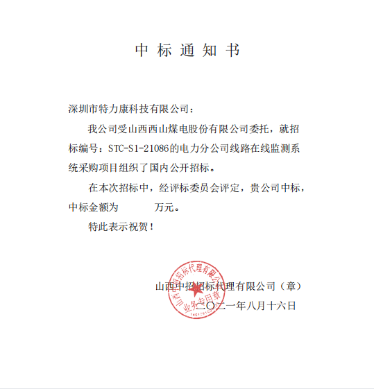 我公可受山西西山煤電股份有限公司委托,就招標(biāo)編號(hào):STC-S1-21086的電力分公司線路在線監(jiān)測系統(tǒng)采購項(xiàng)目組織了國內(nèi)公開招標(biāo)。在本次招標(biāo)中,經(jīng)評(píng)標(biāo)委員會(huì)評(píng)定,我司公司中標(biāo),中標(biāo)公告如下: