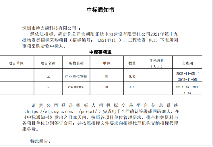 經(jīng)依法招標,確定我司為朝陽正達電力建設(shè)有限責任公司2021年第十九批物資類招標采購項目(招標編號: LN21471I )工程物資包,中標通知如下: