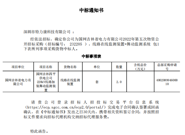 經(jīng)依法招標(biāo),確定我司(深圳特力康)為國(guó)網(wǎng)吉林省電力有限公司2022年第五次物資公開招標(biāo)采購(gòu)(招標(biāo)編號(hào): 232205 ),線路在線監(jiān)測(cè)裝置-舞動(dòng)監(jiān)測(cè)系統(tǒng)包1下表所列事項(xiàng)采購(gòu)貨物中標(biāo)人。中標(biāo)通知如下: