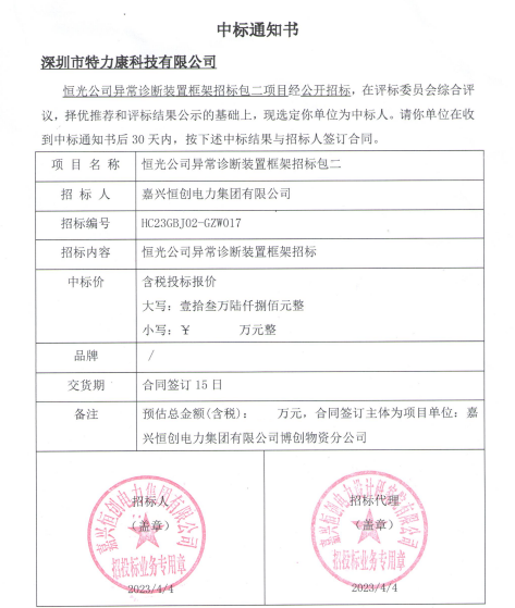 恒光公司異常診斷裝置框架招標包二項目經公開招標,在評標委員會綜合評議,擇優推薦和評標結果公示的基礎上,現選定我司為中標人,中標通知如下: